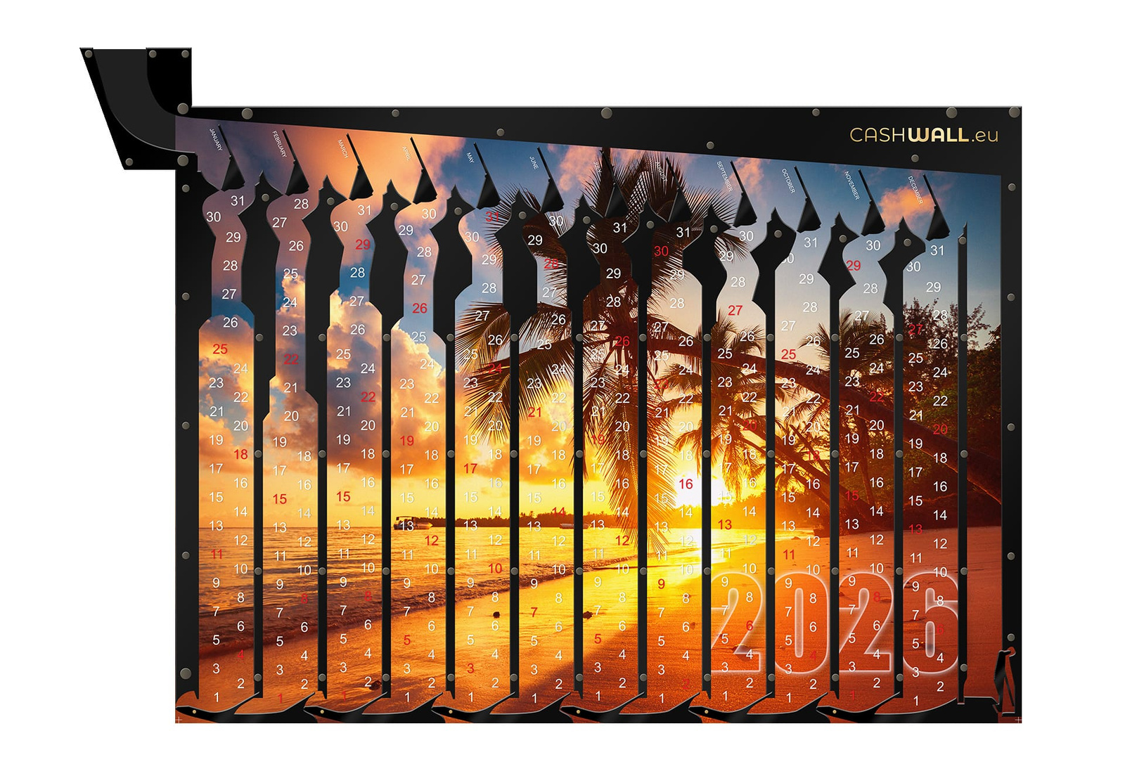 Il calendario 2026 Holidays con una splendida vista è un'ottima idea regalo che può motivare a risparmiare per la vacanza dei propri sogni. Il design del calendario con numeri si adatta a qualsiasi luogo ed è adatto come regalo per tutti. È possibile acquistare il poster del calendario stesso per gli anni futuri sul nostro sito web, e la sostituzione dello sfondo è molto semplice: basta allentare alcune viti sul retro.