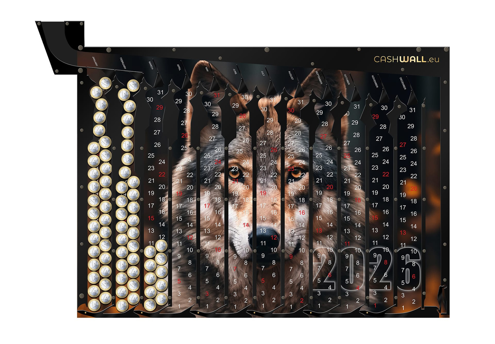 Kalender 2026 Wolf | Unieke wandkalender en spaarpot voor munten